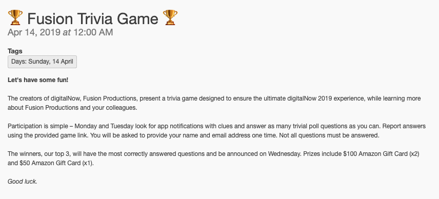 Using the RD Mobile Backoffice and Conferences IO, you can setup a simple trivia game. The advantages of this game are once the setup is done, the game essentially plays itself during your event because there is limited onsite staff support needed during your event. (Huge bonus!) Follow the steps outlined below to create a trivia game for your next event.