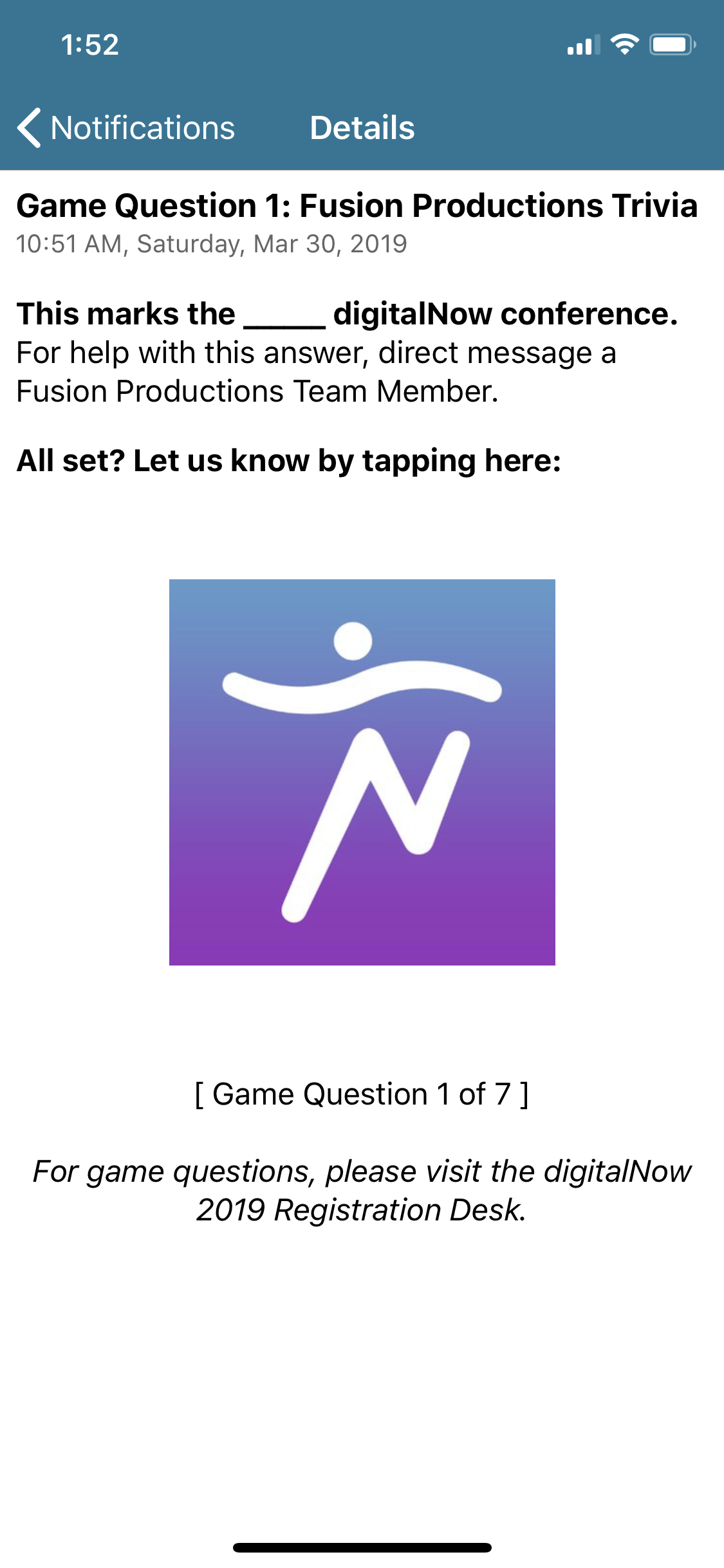 - Now it's game day! The first trivia game question will be sent out via an app notification. Depending on your event, it's recommended to schedule no more than 3 trivia games in a 1-day time period. Remember, you'll also have event