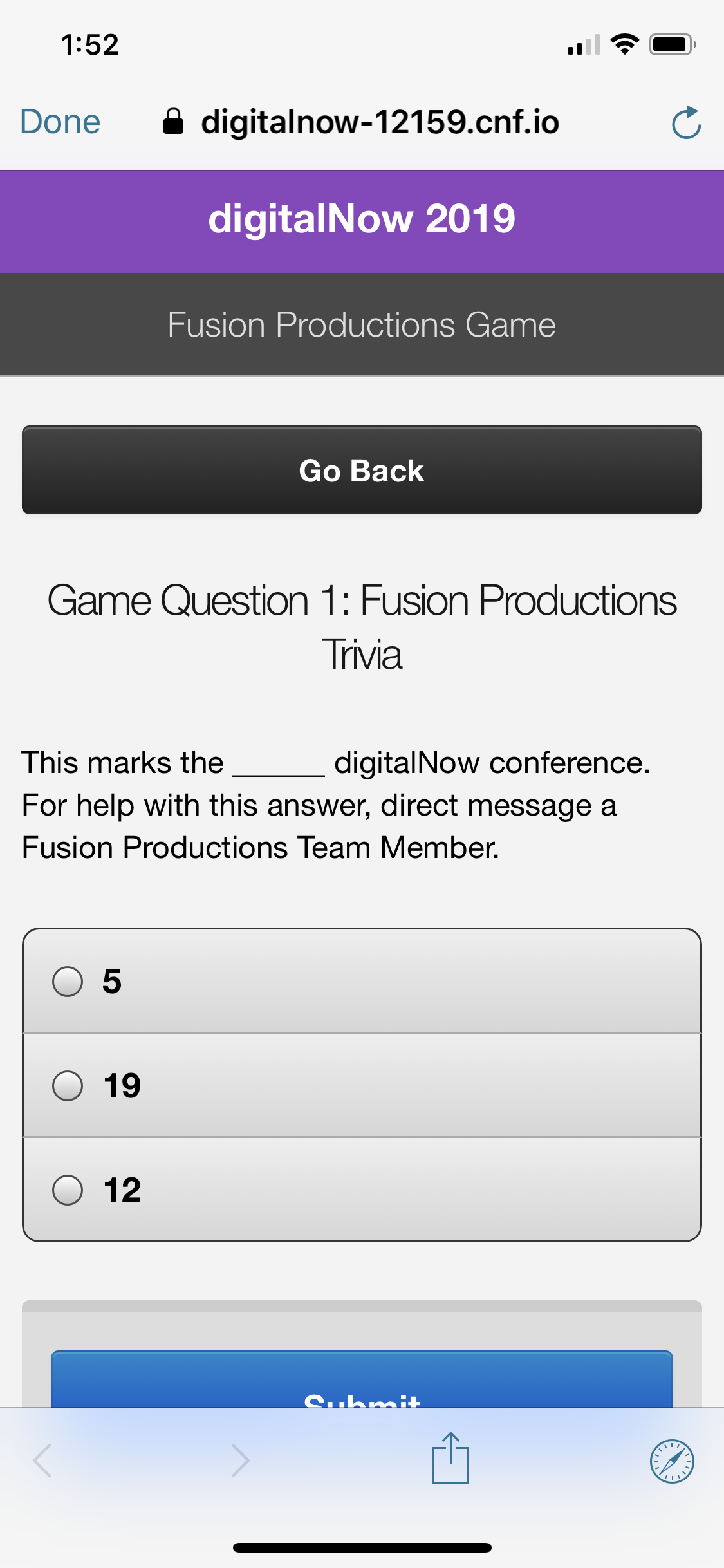 - To submit the answer, the player will tap on the image or button. In this example, the player tapped on the digitalNow Icon (Size: 150x150, PNG) and was directed to Game Question 1.
