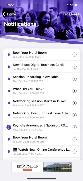 Event Notifications are the best way to announce something to your attendees. These notifications will appear in the app on the event's Notifications screen. They can also be "pushed" to users' devices, which will notify users even if they're not actively using the app.