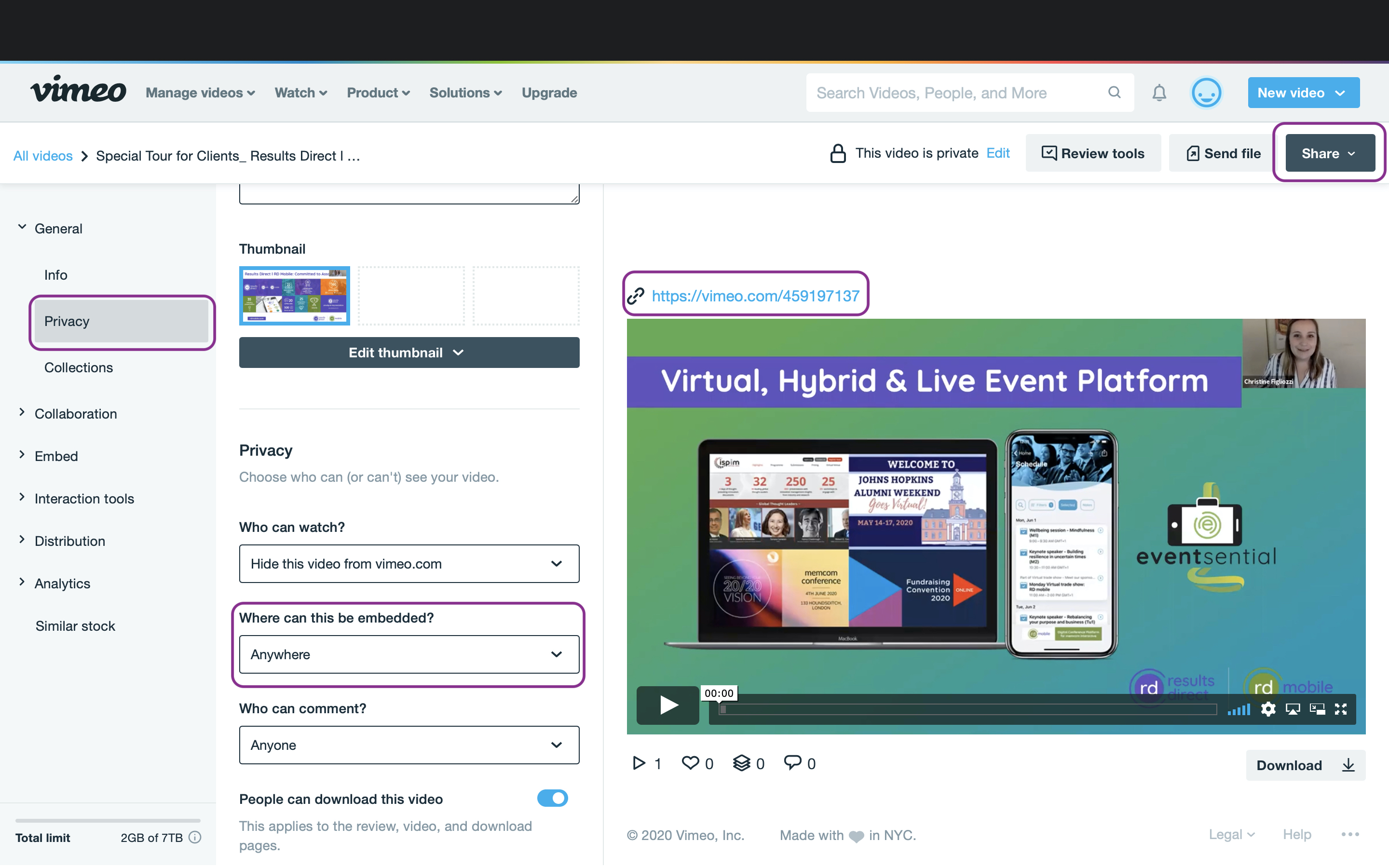 Note: We recommend the privacy setting: "Hide from Vimeo" and "Embed: Anywhere" on the Vimeo platform.