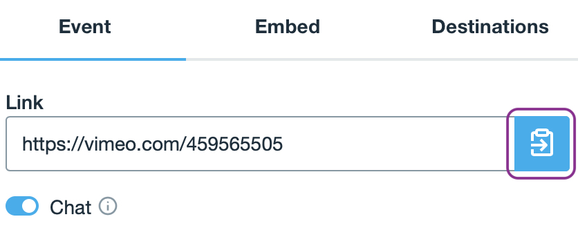 - Live streaming page URL: The “Video Link” from your Vimeo live event.