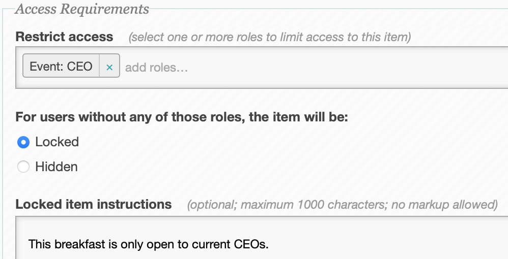 - This allows for message to be presented to participants who do not have the appropriate role(s). This allows for instructions to be provided to potential gain access. Example: This items is lock for Gold members only. To access this content, please contact your event coordinator.