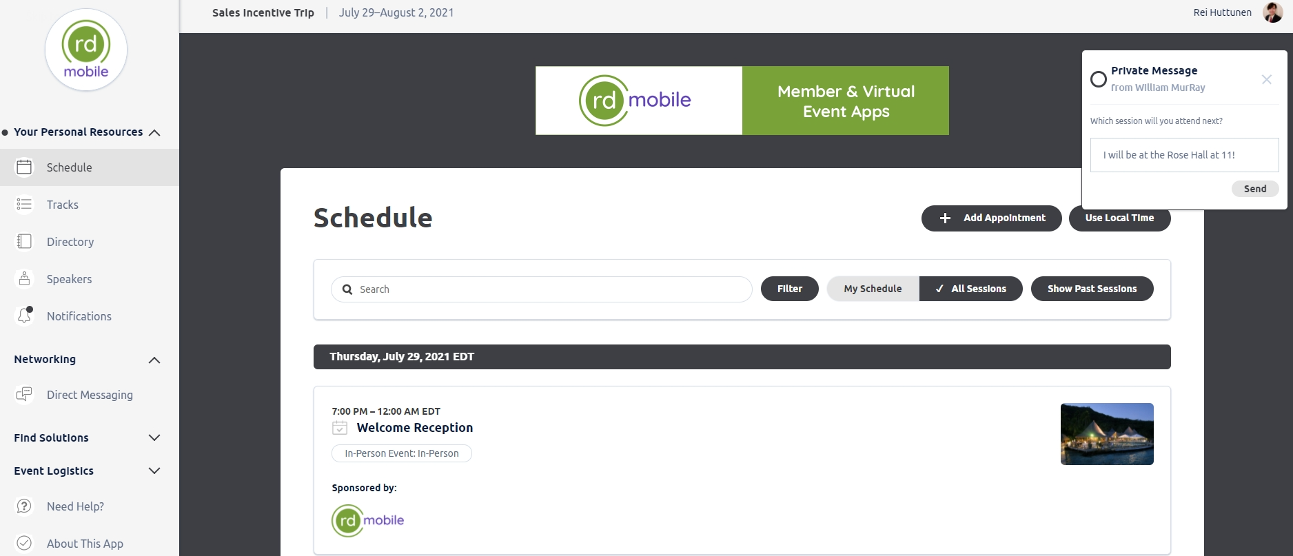Users will also receive Direct Messaging notifications. Similar to the Notifications alert above, countdown will pause when interacting with the pop-up. Users can reply to the message by typing a response, and hitting "Send". All direct correspondence with other attendees can be found by clicking "Direct Messaging" on the Left Navigation panel.