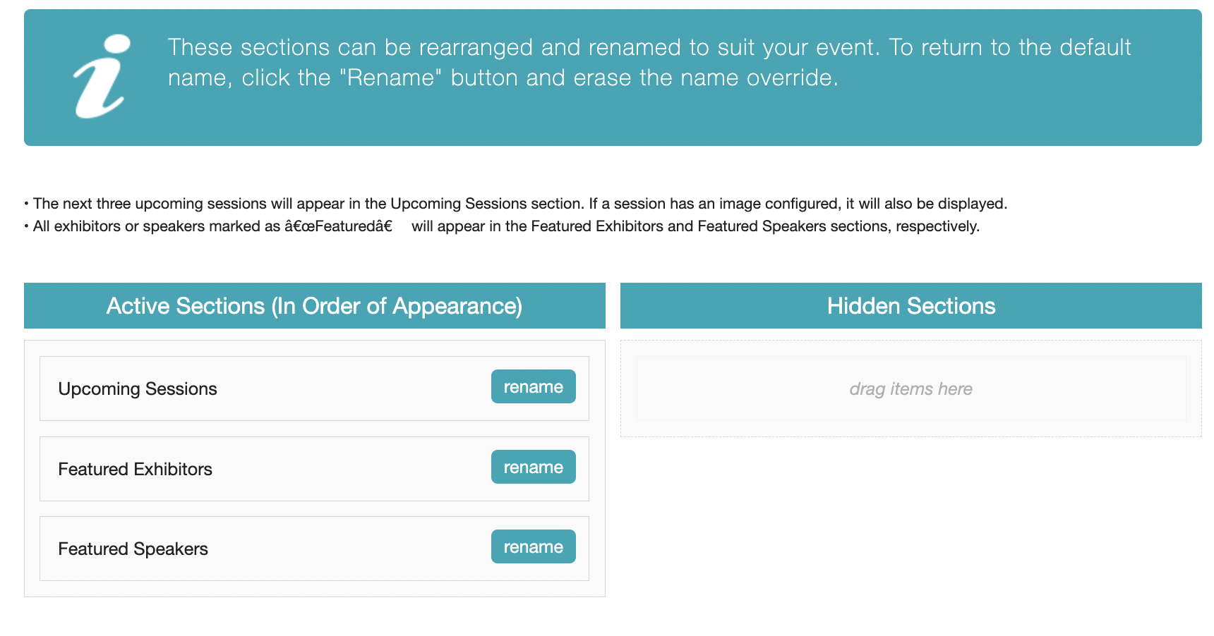 - Featured Content allows you to highlight Speakers, Sessions, or Exhibitors. Drag and drop to order their appearance or to hide any option that doesn't apply to your event.
