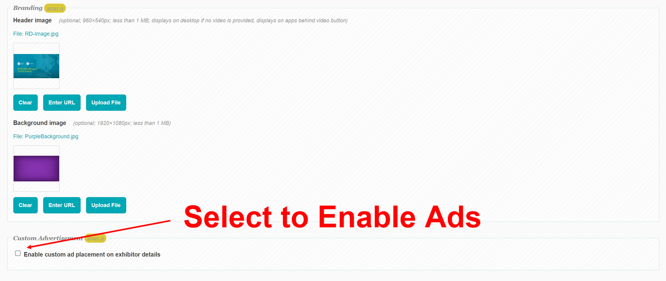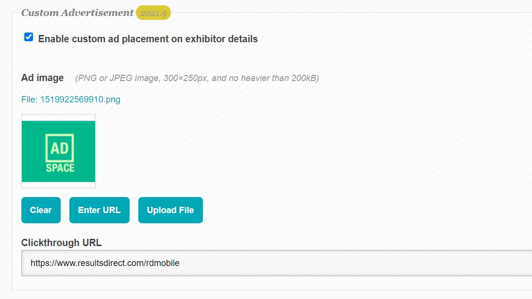 In the same Exhibitor Edit page in the Backoffice, scroll down to the Custom Advertisement section. Select Enable custom ad placement on exhibitor details: