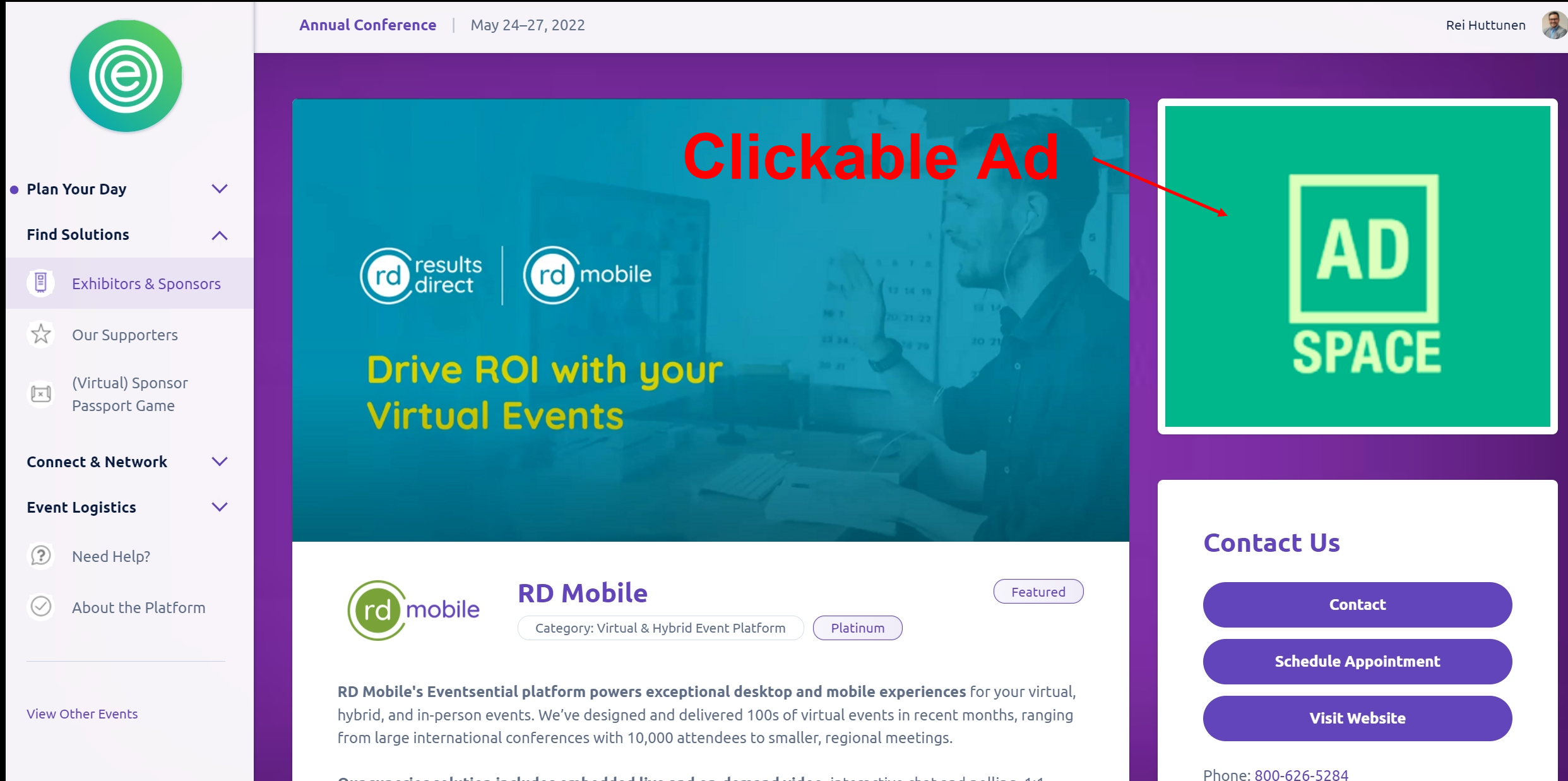 In the apps, the ad will appear at the bottom of the exhibitor details page under Speakers: