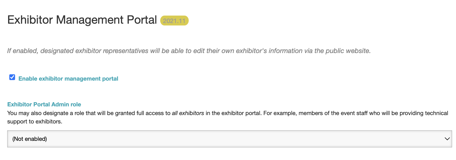 Registrants associated to the Exhibitor can manage their organization's content when the Exhibitor Management portal is enabled. To enable this feature, go to Edit Event> Exhibitors> and check the box to enable the portal. You can also select a role such as 'event staff' to be used to designate full access to all exhibitors in the exhibitor portal.