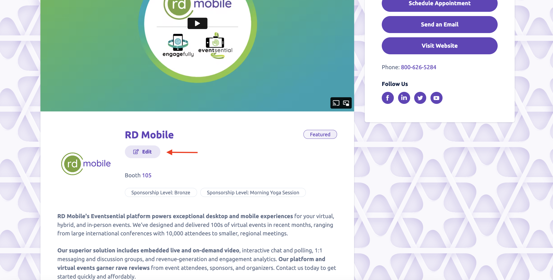 If a registrant is associated to an Exhibitor with this feature enabled, they will see an 'edit' button appear on the Exhibitor page as shown below.