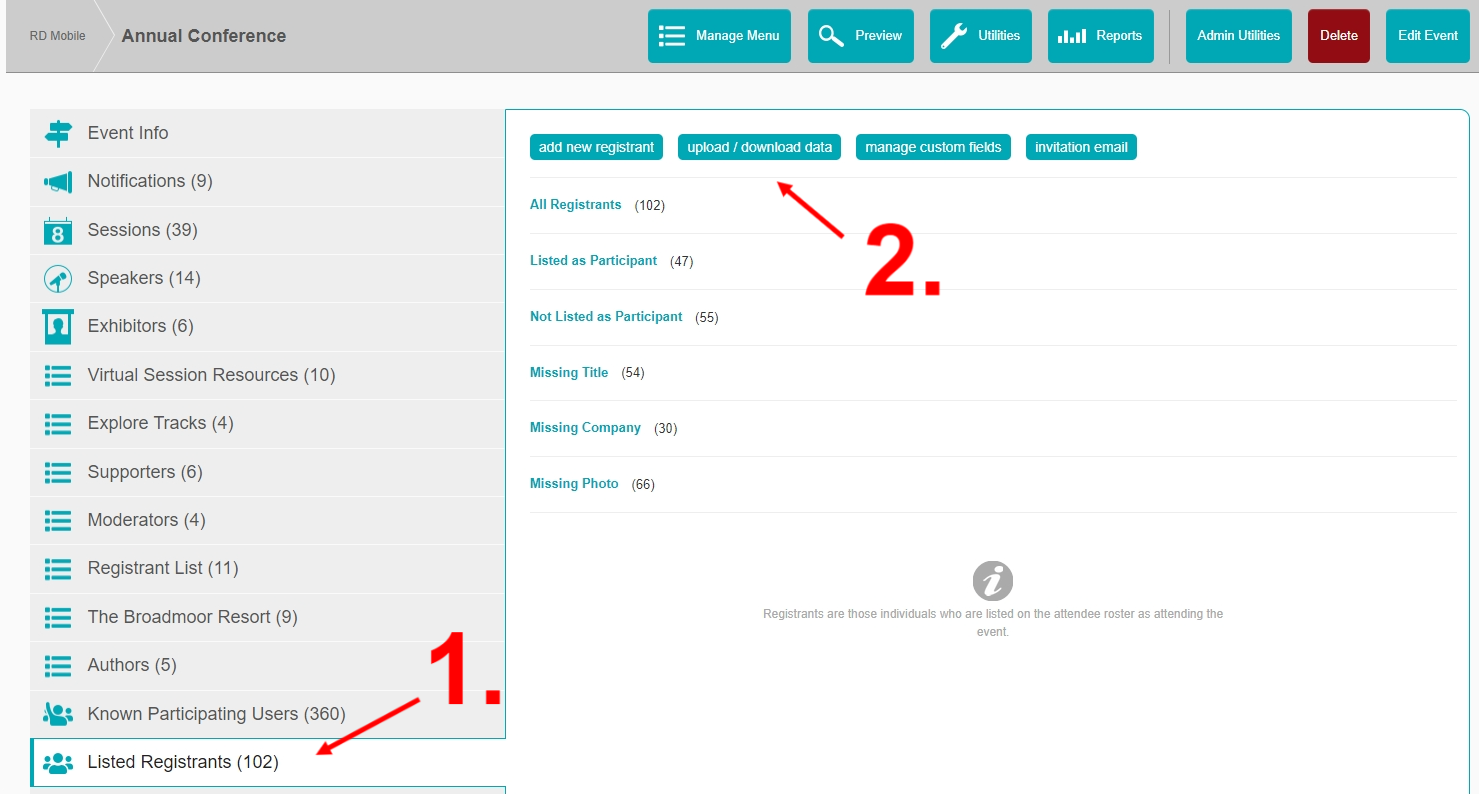 - Navigate to the Listed Registrants tab and click on the upload / download data button: