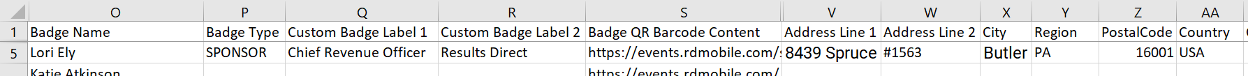 Open the downloaded CSV file from the previous section and confirm that all expected registrant data are present. We recommended sharing the below columns of the CSV file with the third-party badge printing service: