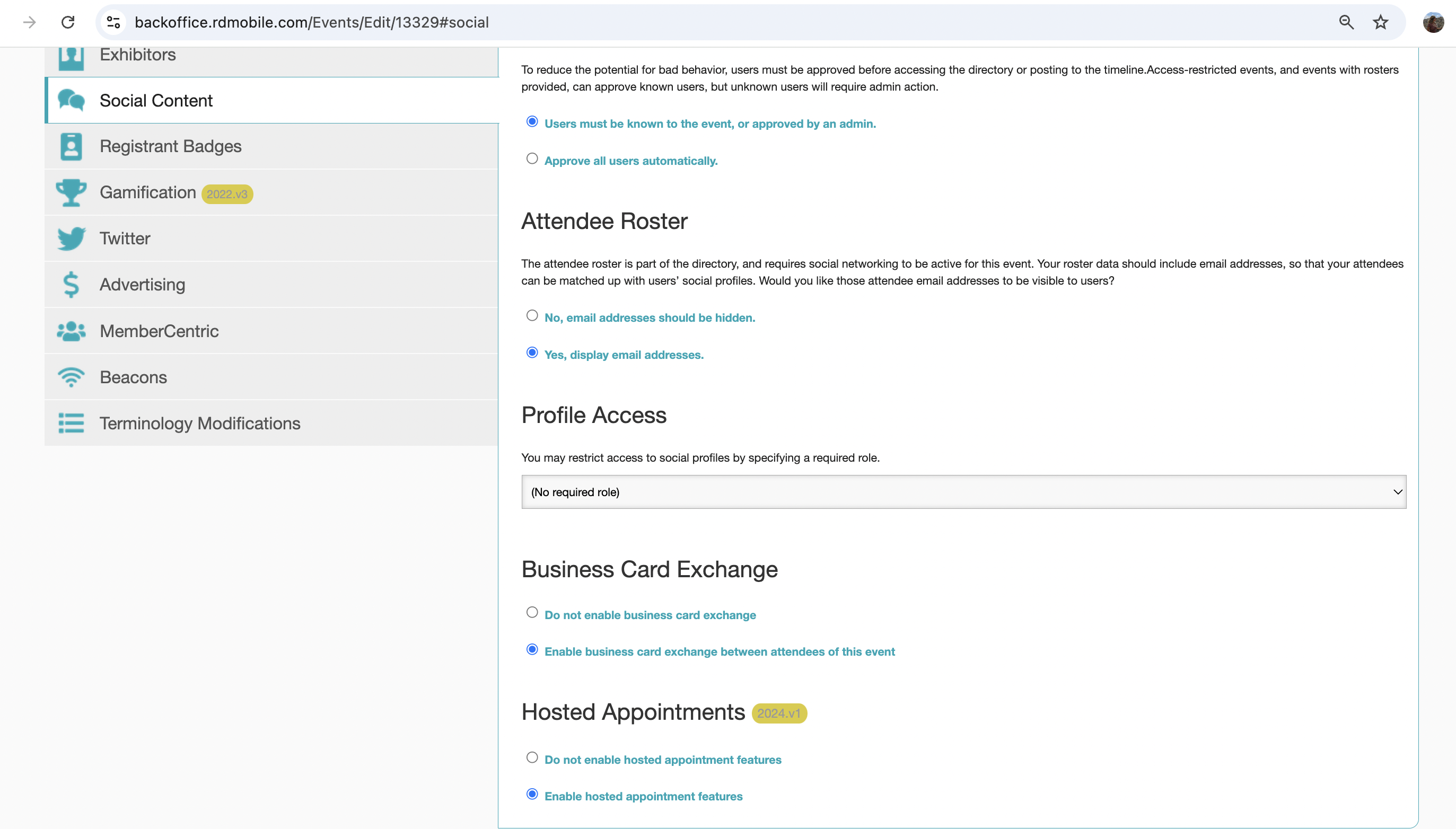 like to enable Hosted Appointments. Clicking the 'Edit Event' button will take you to the to the event management screen. The Event Management Screen is where you enable, disable, or configure features for your event. To enable Hosted Appointments, navigate to the 'Social Content' tab and scroll to Hosted Appointments.