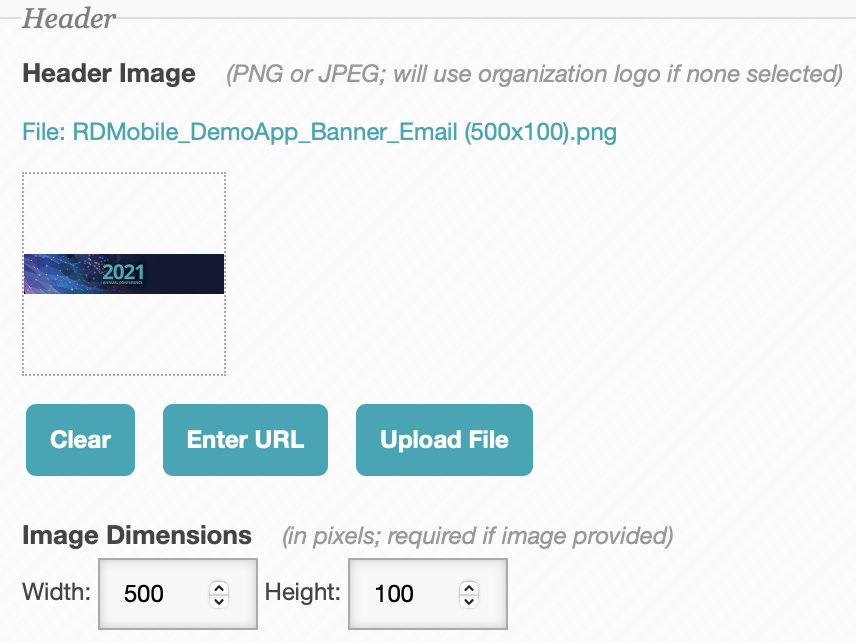 A header image can be placed at the top of the invitation email. The image can be a file uploaded such as a logo or banner image or a URL may be used if you already have a resource available on a public website.