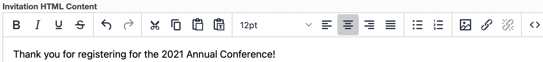 This takes you to a page that allows you to enter custom content for your invitation emails. Each of the sections has some default text with placeholders. Fill in the placeholders to use this text as-is, or modify it as best suits your event.