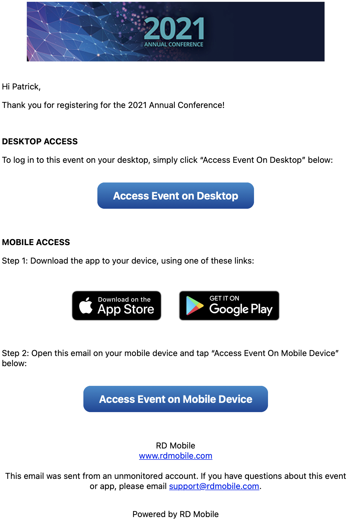When activated, invitation emails are sent out to all your registrants. The invitation will include links to your event on the public website and on the mobile app, where attendees can go right to your event, and begin to create their personal agenda. A link to download the app is provided to assist participants in downloading the appropriate app for their device.