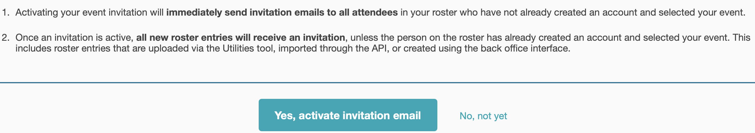 After the invitation has been activated, all new registrants will receive the invitation as they're created, whether that be through the backoffice interface, the upload utility, or through the API.