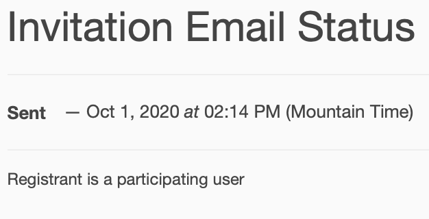 If you wish to make sure that a specific person has received the invitation email you can view their status on their participant profile. If they have not logged in, navigate to their registrant detail page to see when the invitation email was sent. If the user has not already created an account, there will be a button to resend the email.