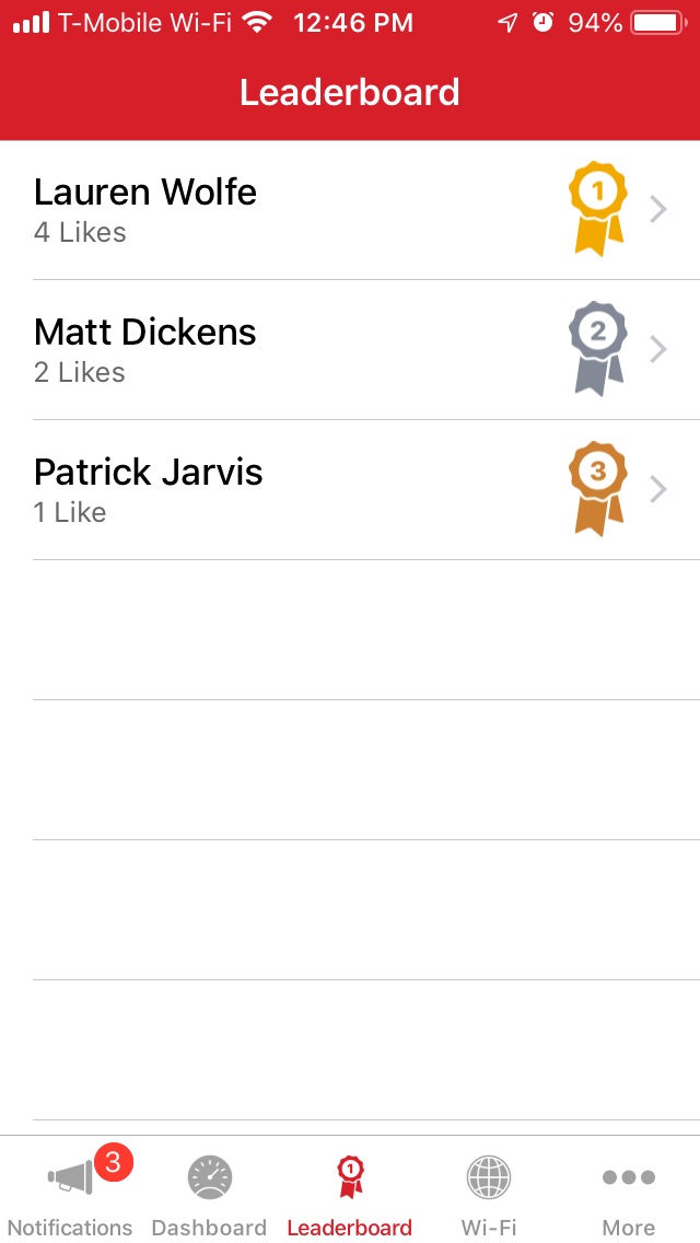 The Leaderboard is a great way to promote engagement with your content through gamification. It's simple to set up, and requires very little staff effort to manage. The Leaderboard displays the most popular contributors to the Timeline, based on the number of likes that the contributor has received across all timeline posts. The top 3 contributors are highlighted.