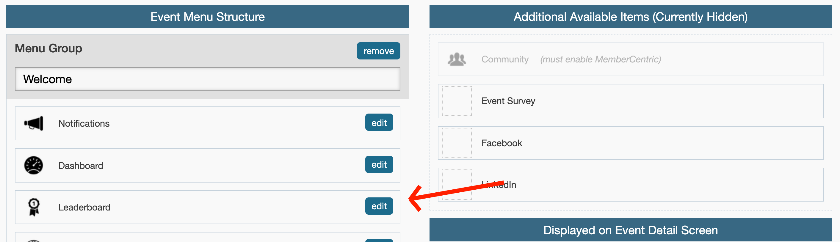 The Leaderboard requires that Social Networking features are enabled at the event level. Then, add the Leaderboard to your menu by editing the event menu structure, and dragging the Leaderboard item onto your menu structure.