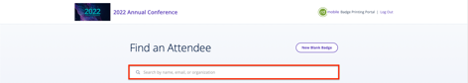 1. To find registrant badges, use the search box and enter the registrants name, email, or organization to locate them. Select the registrant to view their badge.