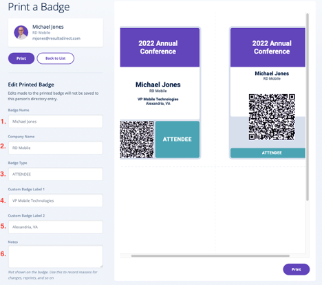 1. The badge information in the badge printing portal is sourced from the back office. If there is a need to update badge info (i.e., a nickname) those changes can be done without affecting the registrant profile. The fields available are: