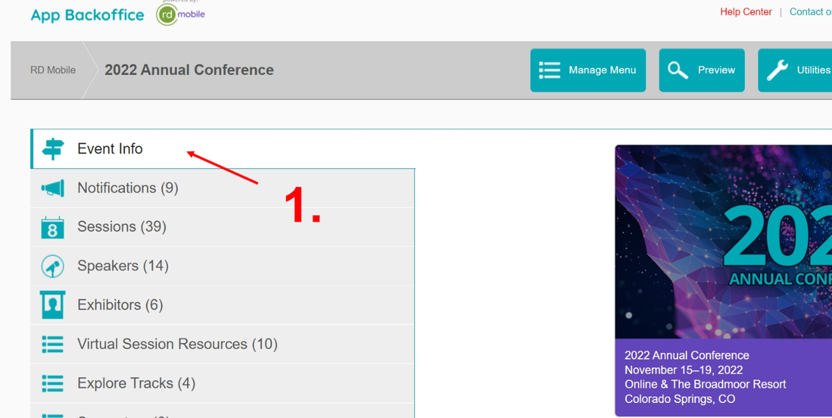 1. Log in to the Backoffice, choose an event, then click Edit Event on the top-right-hand corner and navigate to Registrant Badges: