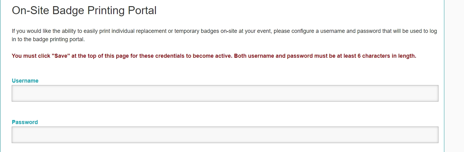 4. On-Site Badge Printing Portal: The Username and Password needed to gain access to the Portal is set under this section.