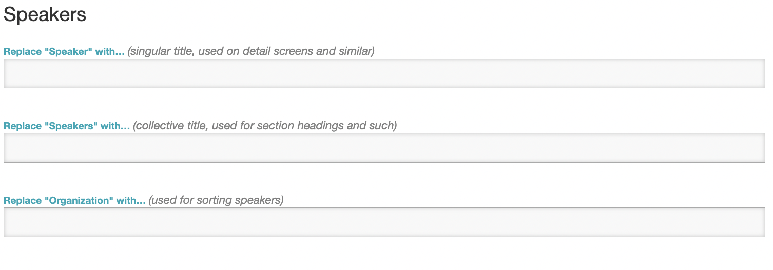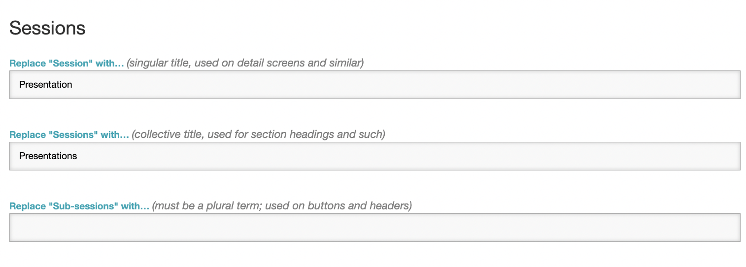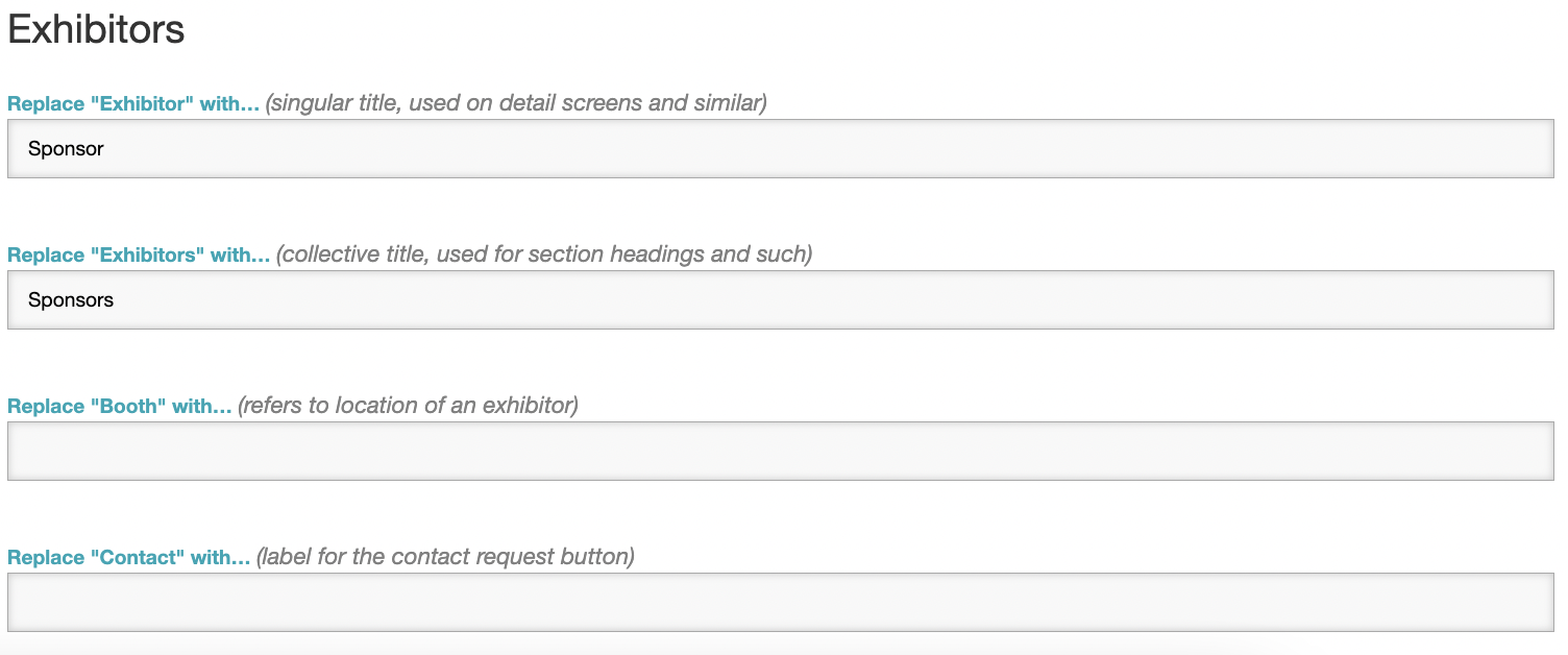 With terminology modifications, you can rename 'Exhibitors' to 'Sponsors', change 'Speakers' to 'Authors', or sub out 'Sessions' for 'Presentations'.