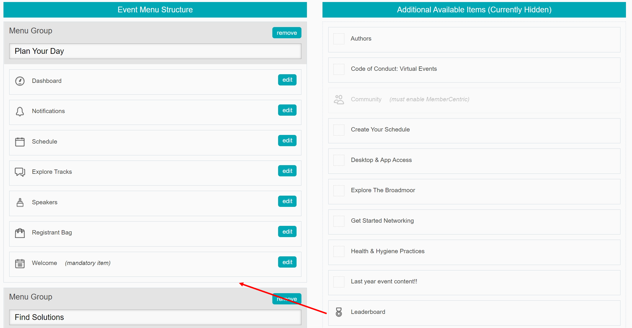 Add the Leaderboard to your menu by editing the event menu, and dragging the Leaderboard item onto your menu structure: Manage Menu > Drag the Leaderboard item over to the left > Save