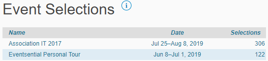 This area provides an overview of how many users have accessed each of your published events, in total. In addition, each event's individual reports can be accessed directly from here by clicking on the event name.