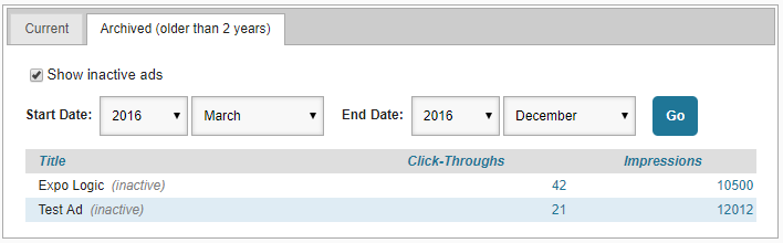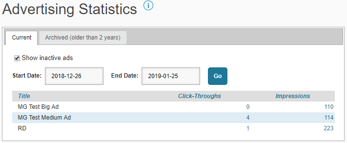 This area summarizes the number of times each of this organization’s ads was displayed on the website or in the application (impressions), and the number of times a user clicked or tapped the ad for more information (click-throughs). These statistics are filterable by date range, dating back to a maximum of two years.